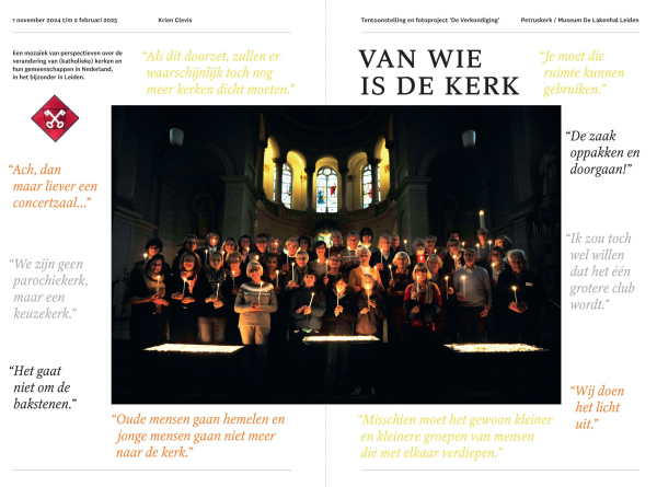 Cover magazine: VAN WIE IS DE KERK. Een mozaiek van perspectieven over de verandering van (katholieke) kerken in Nederland, in het bijzonder in Leiden. Eds. K. Clevis, A. Netiv, M. Falke-de Hoogh. Eindredactie Joost de Wal. Ontwerp frederik de wal. NPN drukkers, 2024. ISBN 978-90-817976-3-4. NUR 646, 639